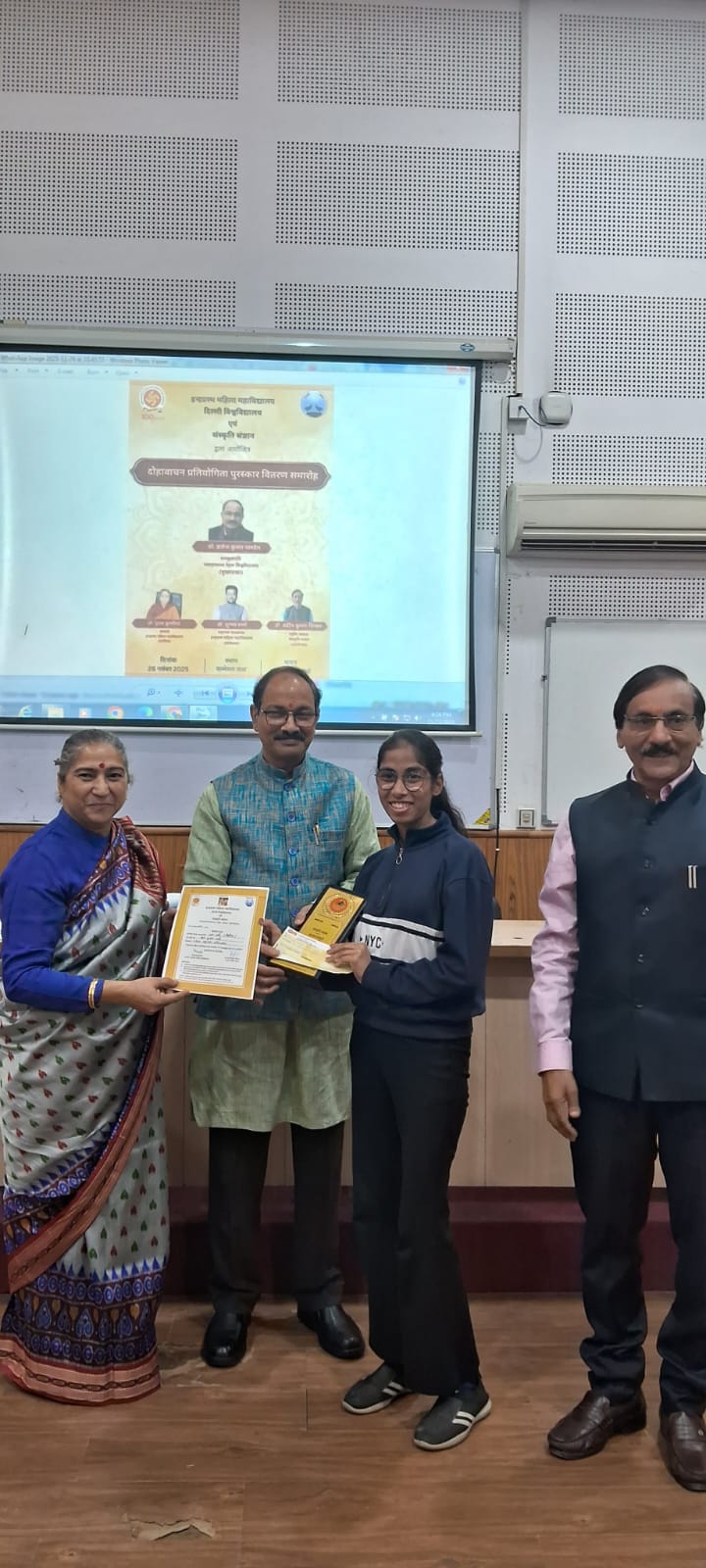 इंद्रप्रस्थ महिला महाविद्यालय एवं संस्कृति संज्ञान संस्था द्वारा 15 अक्टूबर 2025 को आयोजित संगोष्ठी "मानवता के लिए श्री रामचरितमानस एवं रामचरितमानस दोहा वाचन प्रतियोगिता" में विजयी छात्र-छात्राओं का पुरस्कार वितरण कार्यक्रम 26 नवंबर 2025 को इंद्रप्रस्थ महिला महाविद्यालय के सम्मेलन कक्ष में आयोजित किया गया। इस कार्यक्रम के मुख्य अतिथि थे प्रोफेसर बृजेश कुमार पांडे सम उपकुलपति जवाहरलाल नेहरू विश्वविद्यालय,अध्यक्ष प्रोफेसर पूनम कुमारिया प्राचार्या इंद्रप्रस्थ महिला महाविद्यालय, संयोजक डॉक्टर शुभम शर्मा सहायक प्राध्यापक संस्कृत विभाग इंद्रप्रस्थ महिला महाविद्यालय, संयोजक डॉक्टर प्रदीप कुमार सिंघल राष्ट्रीय अध्यक्ष संस्कृति संज्ञान संस्था। दोहा वाचन प्रतियोगिता में प्रथम 10 स्थान प्राप्त करने वाले छात्रों को कैश प्राइज एवं मोमेंटो से सम्मानित किया गया। इस प्रतियोगिता में भाग लेने वाले समस्त 80 से ज्यादा छात्र-छात्राओं को प्रमाण पत्र से सम्मानित किया गया। सभी छात्र-छात्राओं ने श्री रामचरितमानस नित्य 5 मिनट अध्ययन करने का संकल्प लिया।