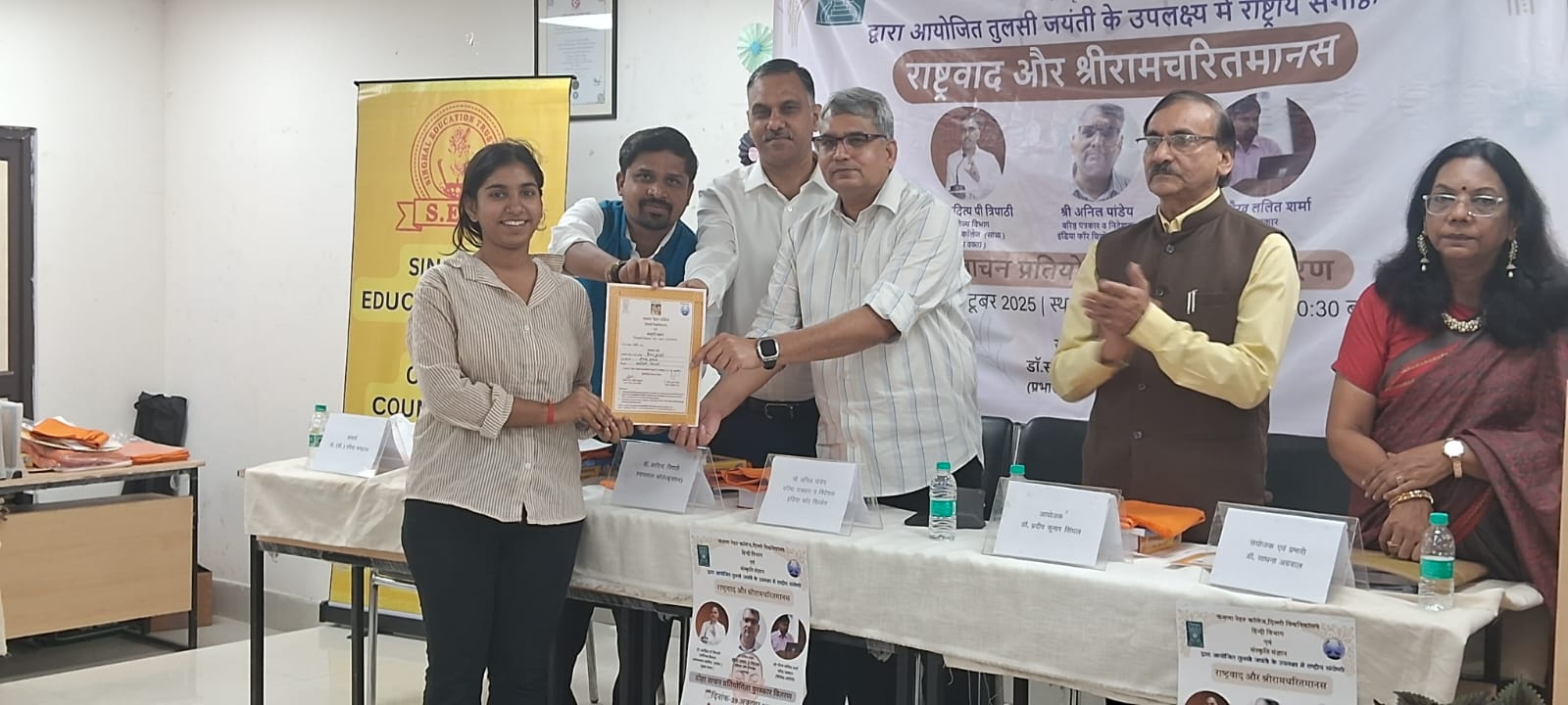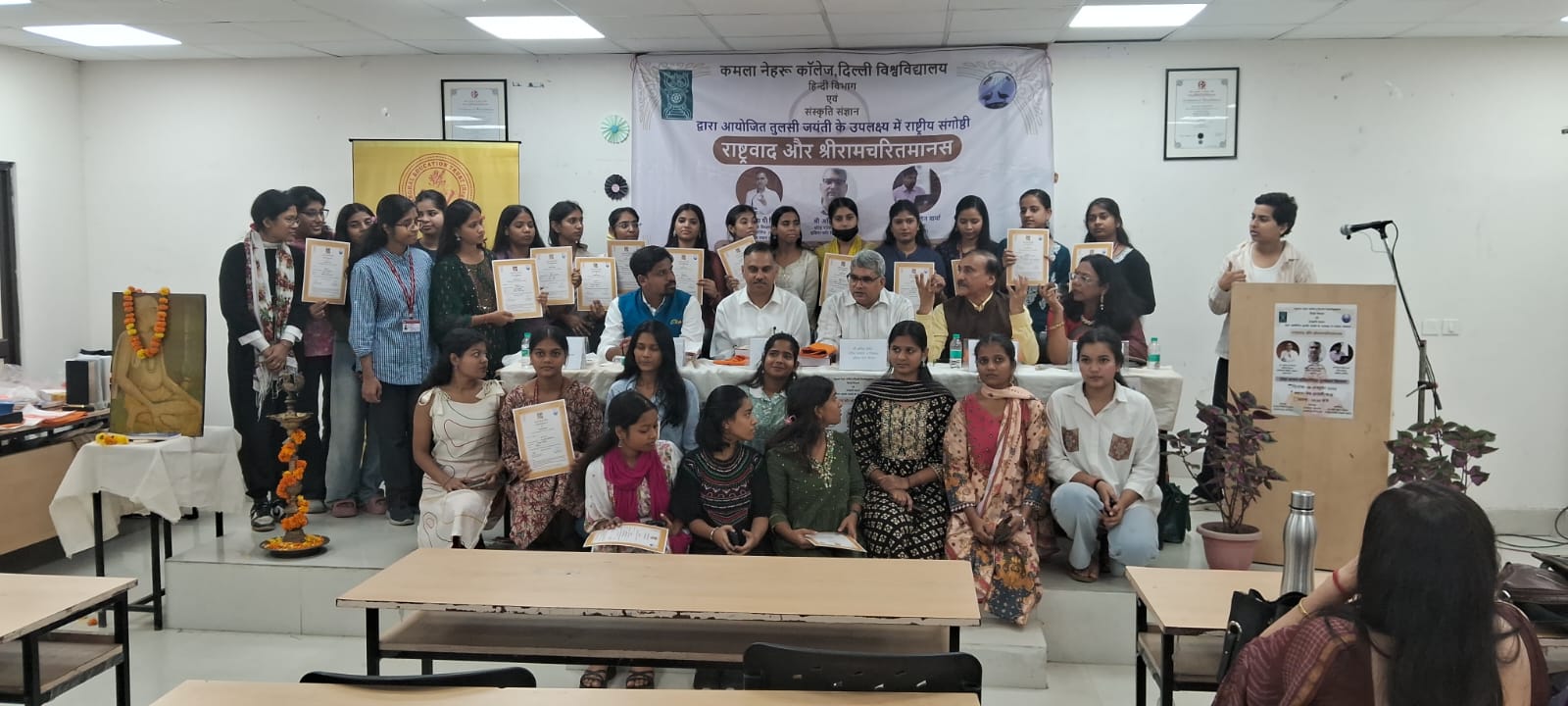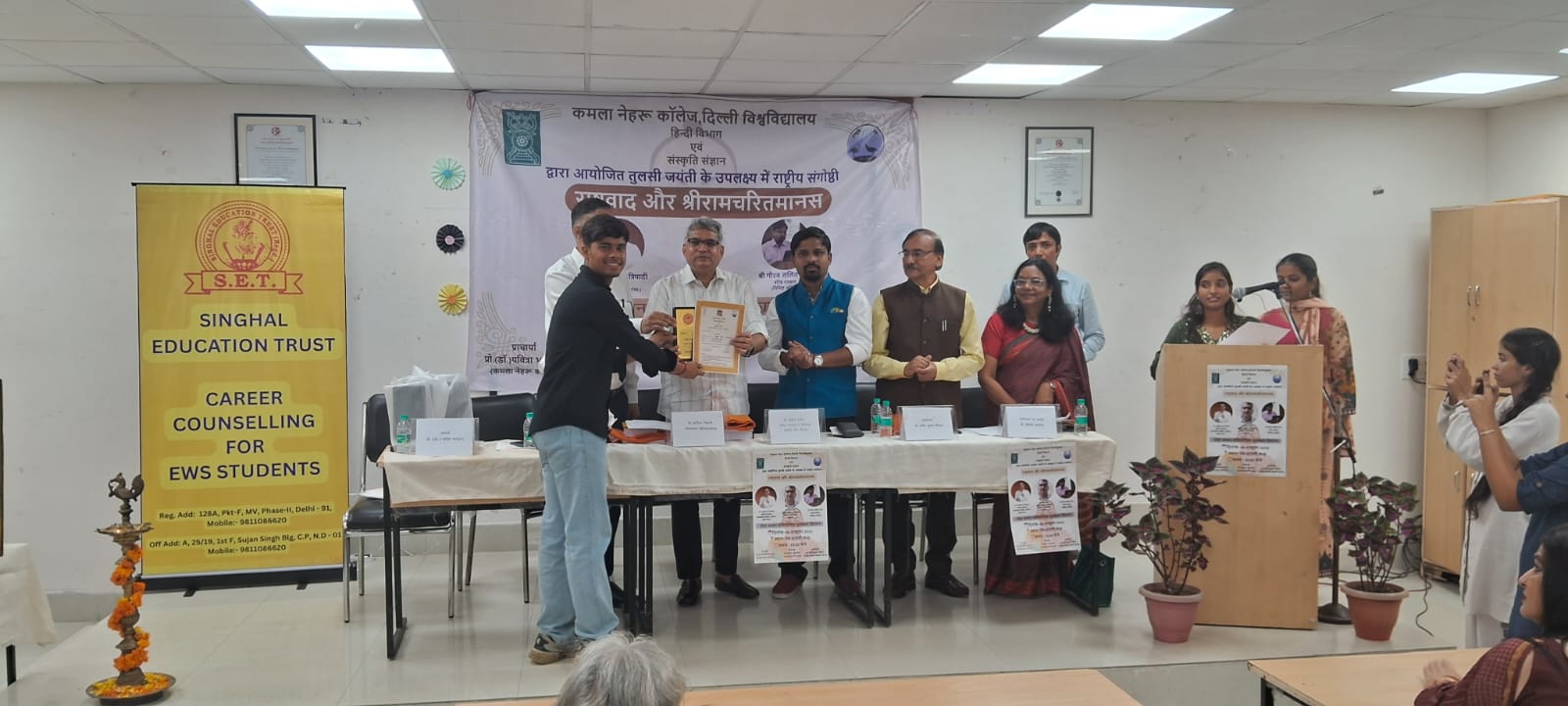 कमला नेहरू कॉलेज हिंदी विभाग एवं संस्कृति संज्ञान संस्था द्वारा तुलसी जयंती के उपलक्ष्य में आयोजित संगोष्ठी "राष्ट्रवाद और रामचरितमानस एवं दोहा वाचन प्रतियोगिता पुरस्कार कार्यक्रम" का आयोजन कमला नेहरू कॉलेज के सम्मेलन कक्ष में 29 अक्टूबर 2025 को संपन्न हुआ कमला नेहरू कॉलेज के सम्मेलन कक्षा में 29 अक्टूबर 2025 को आयोजित कार्यक्रम के मुख्य वक्ता प्रोफेसर आदित्य त्रिपाठी प्रोफेसर कॉमर्स श्यामलाल कॉलेज सांध्य, कार्यक्रम के अध्यक्ष श्री अनिल पांडे जी वरिष्ठ पत्रकार एवं निदेशक इंडिया फॉर चिल्ड्रन, अति विशिष्ट अतिथि श्री गौरव ललित जी वरिष्ठ पत्रकार पीटीआई कमला नेहरू कॉलेज की प्राचार्या प्रोफेसर पवित्रा भारद्वाज जी, कार्यक्रम के आयोजक डॉ प्रदीप कुमार सिंघल राष्ट्रीय अध्यक्ष संस्कृति संज्ञान एवं कार्यक्रम के संयोजक डॉ साधना अग्रवाल प्रभारी हिंदी विभाग कमला नेहरू कॉलेज प्रोफेसर पवित्रा भारद्वाज जी ने अपने उद्बोधन में कहा कि रामचरितमानस आदर्श जीवन जीने का एक माध्यम है हमारी आत्मा और सोच में राम व्याप्त है। प्रोफेसर आदित्य त्रिपाठी जी ने कहा रामचरितमानस और राष्ट्रवाद विषय रामचरितमानस को समझने के लिए हमें सबसे पहले प्रभु श्री राम को समझना होगा प्रभु श्री राम का जीवन हमें मर्यादित रहना सिखाता है विश्वामित्र तमाम शक्तियां होने के बावजूद राजा दशरथ से श्री राम और लक्ष्मण को राक्षसों का नाश करने के लिए मांगते हैं ऐसा वह युवाओं को आगे लाने के लिए करते हैं हमें अगर जीवन में सफल होना है तो अपने आसपास सकारात्मक और वरिष्ठ जनों से संपर्क स्थापित कर उनका मार्गदर्शन सदैव लेते रहना चाहिए। डॉ प्रदीप कुमार सिंघल अध्यक्ष संस्कृति संज्ञान संस्थान ने बताया कि संस्था का उद्देश्य रामचरितमानस के द्वारा छात्र-छात्राओं और युवाओं का व्यक्तित्व एवं चरित्र निर्माण करना है श्री अनिल पांडे जी ने कहा कि रामचरितमानस में एक राष्ट्र की संकल्पना का सुदृढ़ उल्लेख मिलता है रामचरितमानस के संदर्भ में राष्ट्रवाद हमारे भीतर पहले से ही व्याप्त है राष्ट्र तभी सुरक्षित होगा जब हम सफल और सक्षम होंगे किंतु इसका यह अभिप्राय बिल्कुल नहीं है कि हम किसी पर आक्रमण कर दें रामचरितमानस को आदर्श जीवन जीने का एक माध्यम बनाएं 20 सितंबर 2025 को कमला नेहरू कॉलेज में श्री रामचरितमानस दोहा वाचन प्रतियोगिता का आयोजन किया गया था इस प्रतियोगिता में दिल्ली विश्वविद्यालय के 30 से ज्यादा महाविद्यालयों के 100 से ज्यादा छात्र-छात्राओं ने भाग लिया। प्रत्येक विद्यार्थी ने तीन दोहे या चौपाइयों की प्रस्तुति की। इस प्रतियोगिता के प्रथम 13 स्थान प्राप्त करने वाले छात्र-छात्राओं को पुरस्कार एवं प्रमाण पत्र से सम्मानित किया गया प्र