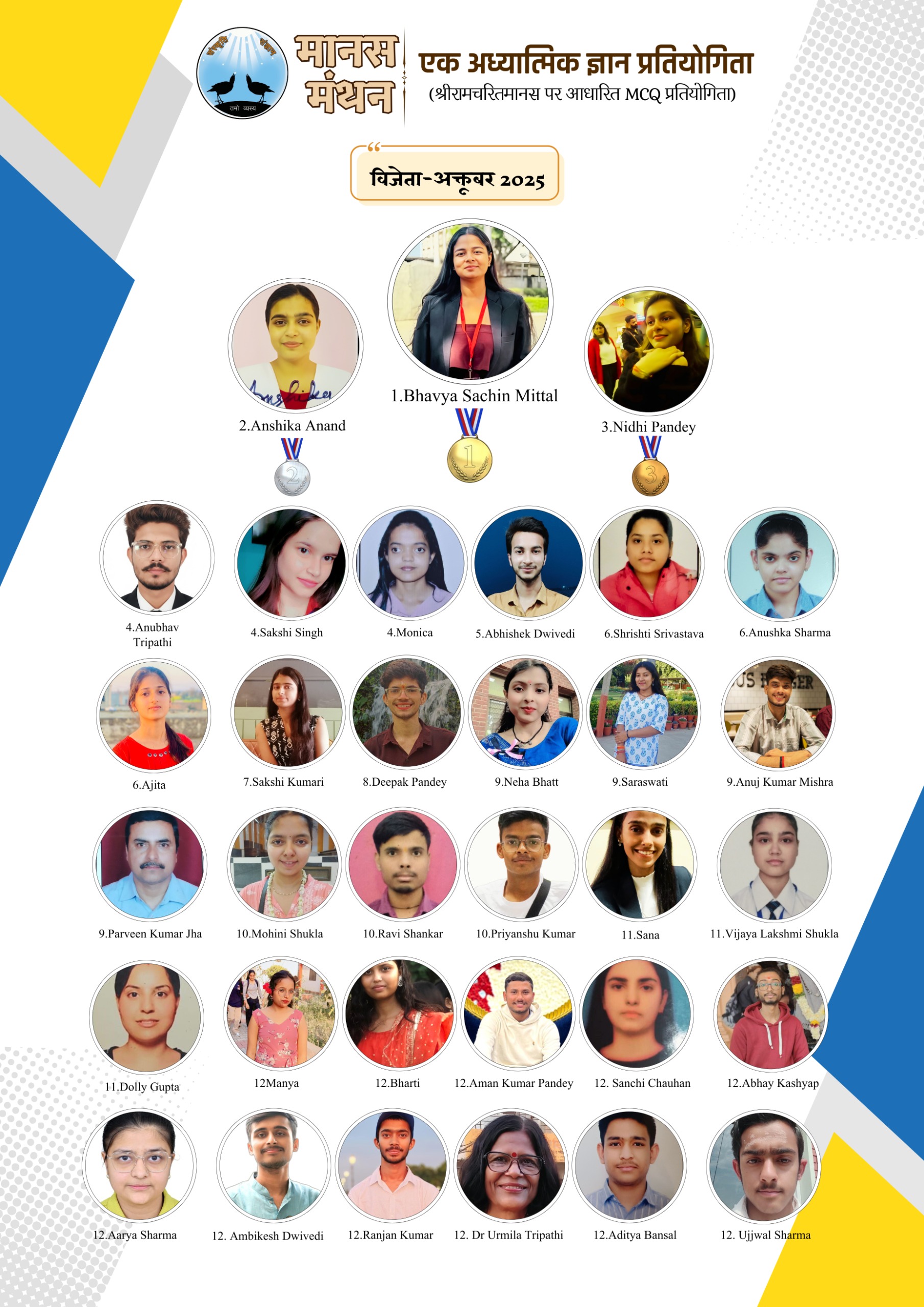 संस्कृति संज्ञान संस्था द्वारा 30 अगस्त 2025 को मानस मंथन ऑनलाइन एमसीक्यू प्रतियोगिता का आयोजन किया गया। इस प्रतियोगिता में 800 से ज्यादा छात्रों ने रजिस्ट्रेशन कराया तथा 500 के करीब छात्रों ने भाग लिया। प्रतियोगिता में प्रथम 20 स्थान निर्धारित करने के लिए 33 छात्र-छात्राओं को ऑनलाइन इंटरव्यू के लिए आमंत्रित किया गया। इंटरव्यू में उन्हें राम अंगद संवाद से चुने हुए 4 दोहे या चौपाइयों की कंठस्थ प्रस्तुति, अर्थ एवं संदेश बताना था। यह बहुत ही सुखद अनुभव है कि इन सभी छात्रों का प्रदर्शन बहुत ही प्रशंसनीय था और प्रथम 20 स्थान निर्धारित करना संस्था के सदस्यों के लिए अत्यंत कठिन कार्य था। काफी विचार विमर्श के पश्चात 24 छात्रों को पुरस्कार और सम्मान के लिए चुना गया। सभी चयनित विद्यार्थियों को संस्था की हार्दिक बधाई और शुभकामनाएं।