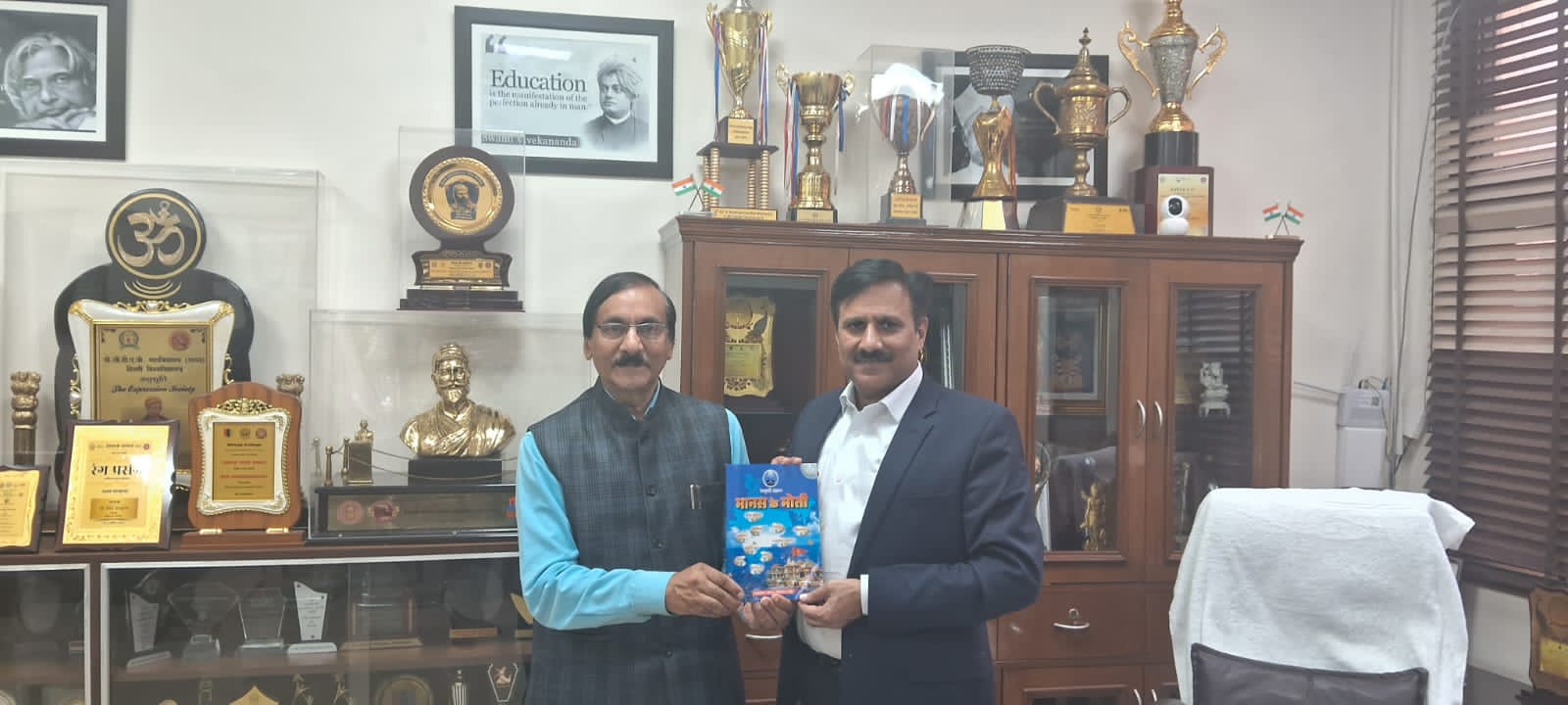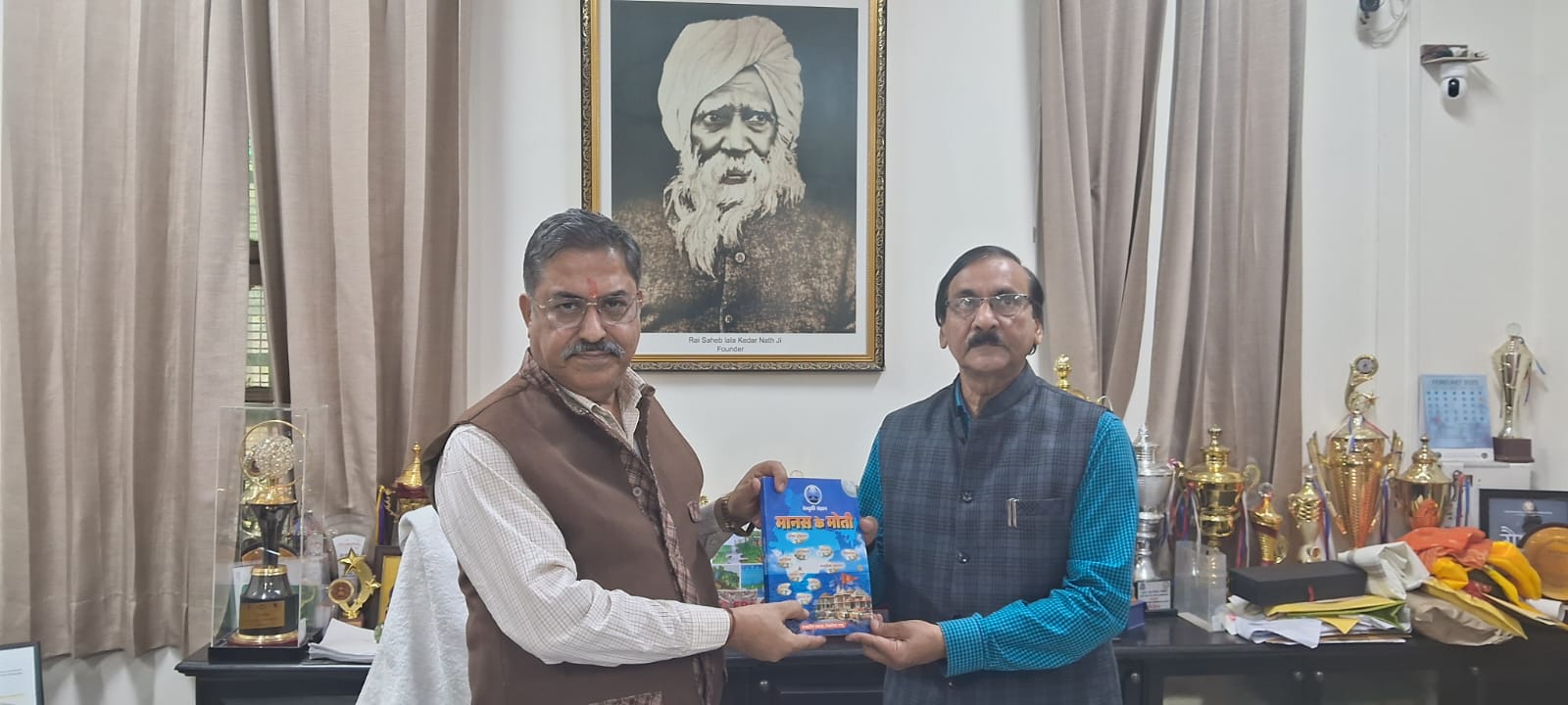 दिनांक 24 मई 2025 को संस्कृति संज्ञान संस्था के राष्ट्रीय अध्यक्ष डॉ प्रदीप कुमार सिंघल, संस्कृति संज्ञान कार्यकारिणी के सदस्य प्रोफेसर रामराज उपाध्याय जी, डायरेक्टर पुरोहित विभाग श्री लाल बहादुर शास्त्री राष्ट्रीय संस्कृत विश्वविद्यालय, प्रोफेसर रजनीश खरे एवं प्रोफेसर राकेश दुबे जी ने आदरणीय श्री के न रघुनंदन, संगठन मंत्री विद्या भारती से वी पी हाउस में मुलाकात की। संस्था द्वारा प्रकाशित पुस्तिका "मानस के मोती*, दिल्ली विश्वविद्यालय के छात्रों द्वारा प्रकाशित त्रैमासिक पत्रिका "मानस दर्पण" एवं राम दरबार उनको भेंट किया। आदरणीय रघुनंदन जी को हमने बताया कि "मानस के मोती"है पुस्तिका पर किए गए शोध कार्य से यह स्पष्ट हुआ है कि श्रीरामचरितमानस में प्रबंधन एवं नेतृत्व क्षमता विषय पर बहुत से प्रसंग है जो छात्र व्यावहारिक रूप में सीख सकते हैं। संस्था से जुड़े बुद्धिजीवियों का मानना है कि इस विषय को भारतीय ज्ञान प्रणाली (IKS) मूल्य वर्धित पाठ्यक्रम (VALUE ADDED COURSE) के अंतर्गत विश्वविद्यालय के छात्रों को पढ़ाया जाना चाहिए आदरणीय *श्री रघुनंदन जी ने इस विषय पर पूरी रुचि दिखाई और आश्वासन दिया कि इस विषय को किस तरह से विश्वविद्यालय में शामिल किया जाए इसकी रूपरेखा तैयार कराई जाएगी। संस्था को पूरा विश्वास है कि श्री रामचरितमानस में निहित जीवन के मूल्यों से भारतवर्ष के छात्र एवं युवा अपने जीवन को सर्वश्रेष्ठ बनाएंगे तभी समाज एवं राष्ट्र के विकास में अपनी महत्वपूर्ण भूमिका निभा पायेंगे
