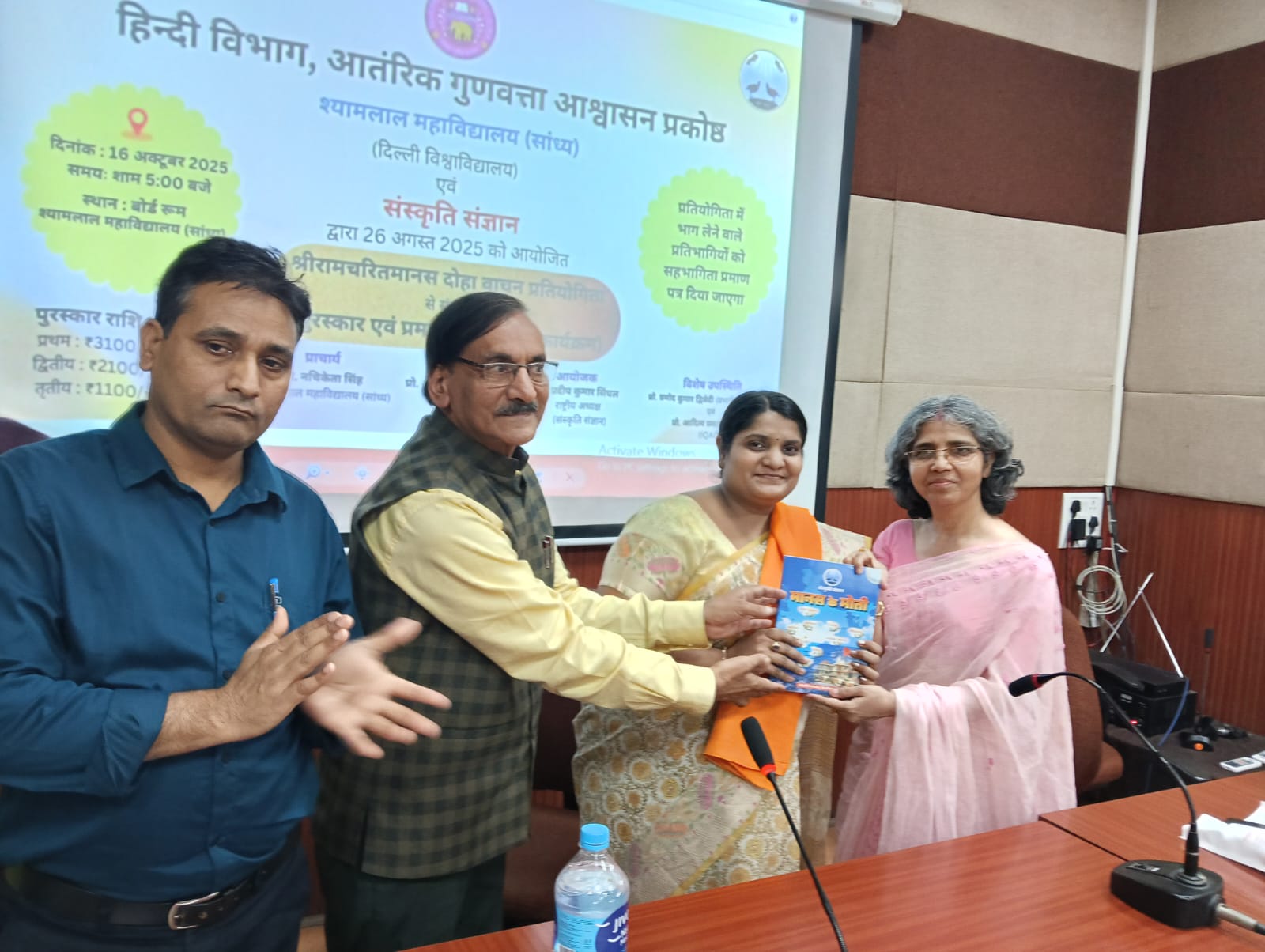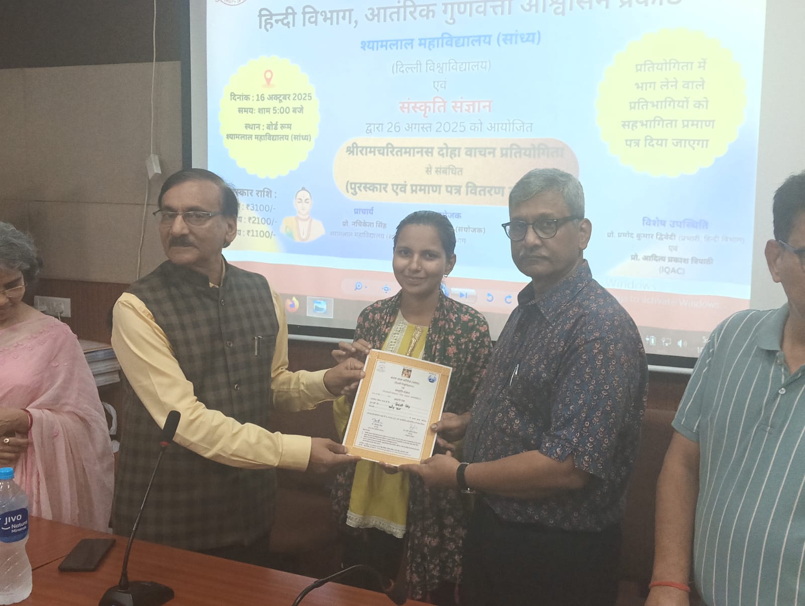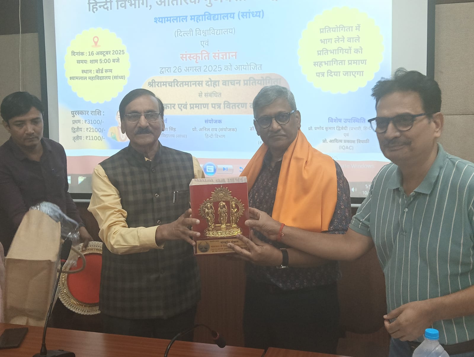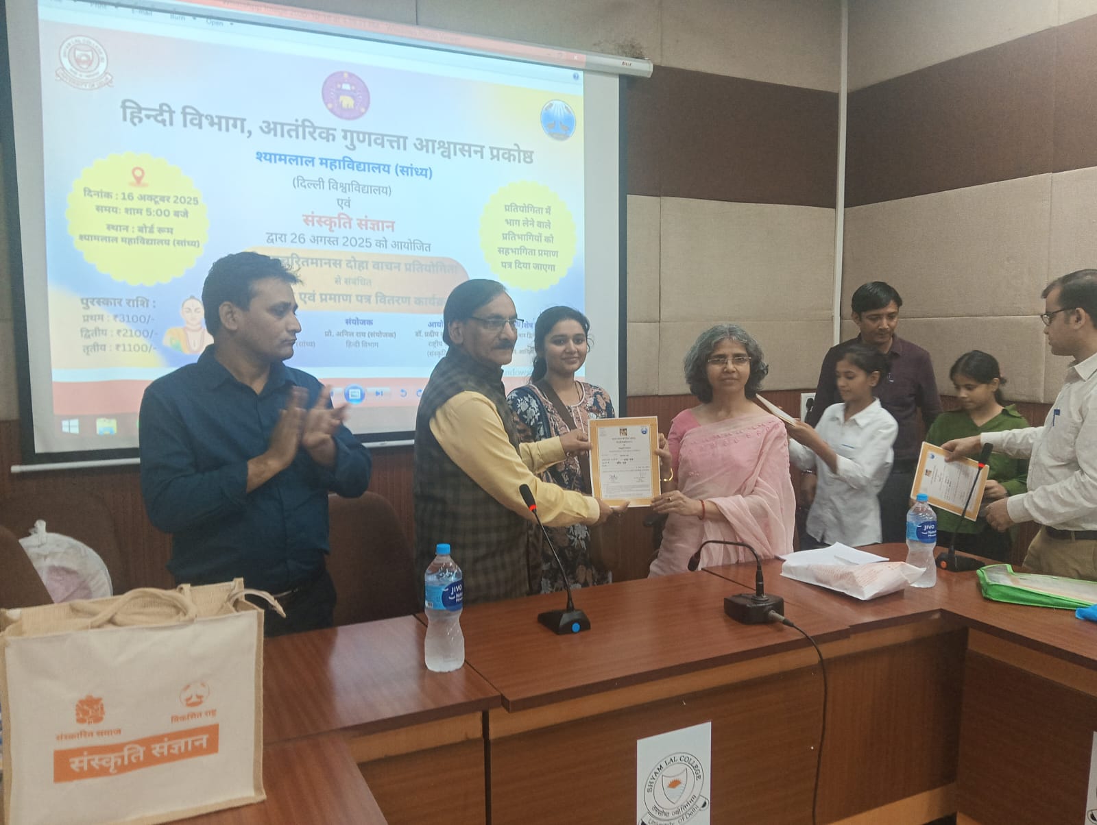 संस्कृति संज्ञान संस्था एवं श्यामलाल कॉलेज सांध्य दिल्ली विश्वविद्यालय द्वारा 26 अगस्त 2025 को श्री रामचरितमानस दोहा वाचन प्रतियोगिता का आयोजन किया। इस प्रतियोगिता में भाग लेने वाले प्रतिभागियों को 16 अक्टूबर 2025 को पुरस्कारित एवं सम्मानित किया गया। इस कार्यक्रम के अध्यक्ष प्रोफेसर नचिकेता प्राचार्य श्यामलाल कॉलेज सांध्य, संयोजक डॉ नीरज मिश्रा एवं आयोजक डॉक्टर प्रदीप कुमार सिंघल राष्ट्रीय अध्यक्ष संस्कृति संज्ञान संस्था थे। सभी अतिथियों ने श्री रामचरितमानस के द्वारा छात्र-छात्राएं अपने व्यक्तित्व और चरित्र का निर्माण किस तरह से कर सकते हैं इस पर चर्चा की। नित्य पांच या 10 मिनट के लिए श्री रामचरितमानस को एक किताब की तरह अध्ययन करने की सलाह सब अतिथियों ने छात्र-छात्राओं को दी। इस समारोह में श्री रामचरितमानस दोहा वाचन प्रतियोगिता में प्रथम तीन स्थान प्राप्त करने वाले छात्रों को कैश पुरस्कार प्रथम ₹3100, द्वितीय ₹2100, तृतीय ₹1100, मोमेंटो एवं प्रमाण पत्र, चौथे से दसवां स्थान प्राप्त करने वाले प्रतिभागियों को मोमेंटो एवं प्रमाण पत्र एवं अन्य प्रतिभागियों को प्रमाण पत्र से सम्मानित किया गया। उपस्थित सभी छात्र-छात्राओं ने श्री रामचरितमानस का नित्य 5 मिनट अध्ययन करने का संकल्प लिया।