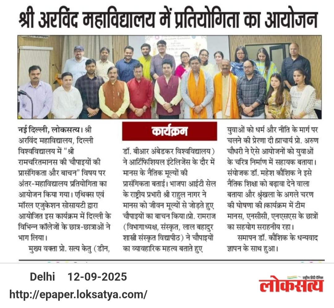संस्कृति संज्ञान संस्था एवं श्री अरविंदो कॉलेज द्वारा 11 सितंबर 2025 को श्री अरविंदो कॉलेज के सम्मेलन कक्ष में "श्रीरामचरितमानस दोहावाचन प्रतियोगिता का आयोजन किया गया। इस प्रतियोगिता में दिल्ली विश्वविद्यालय के विभिन्न महाविद्यालयों से 180 से ज्यादा छात्रों ने रजिस्ट्रेशन कराया और 60 छात्रों ने इस प्रतियोगिता में भाग लिया। सभी छात्रों ने श्री रामचरितमानस के पांच दोहे या चौपाइयों की बहुत ही सुंदर कंठस्थ प्रस्तुति की, उसका अर्थ बताया और उसका संदेश जो उनके लिए, परिवार, समाज और राष्ट्र के लिए हितकारी हो, उसे बताया। इस प्रतियोगिता से श्री अरविंदो कॉलेज के प्रांगण में एक सकारात्मक सोच का सृजन हुआ, श्री अरविंदो कॉलेज के समस्त अध्यापकों एवं वहां पर आए हुए समस्त छात्र-छात्राओं को यह एहसास हुआ कि श्री रामचरितमानस के नित्य पाठ से वह न केवल अपना चरित्र और व्यक्तित्व निर्माण कर पाएंगे वरन् वह परिवार, समाज और राष्ट्र के लिए भी श्रेष्ठ कार्य करने के लिए प्रोत्साहित हो सकेंगे।