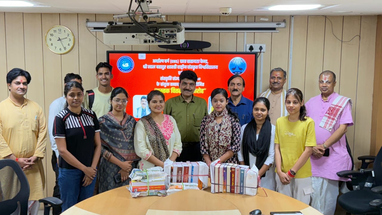 श्री लाल बहादुर शास्त्री राष्ट्रीय संस्कृत विश्वविद्यालय एवं संस्कृति संज्ञान संस्था ने माननीय श्री राजकुमार गोयल, एम.डी एस.एल.आर मेटालिक्स, होसपेट, बेल्लारी कर्नाटक, के सौजन्य से दिनांक 21मई 2025 को श्री लाल बहादुर शास्त्री राष्ट्रीय संस्कृत विश्वविद्यालय की आर्थिक रूप से गरीब छात्राओं को पुस्तकों (₹5000 प्रति छात्रा) का वितरण किया। इस कार्यक्रम के मुख्य अतिथि आदरणीय प्रोफेसर मुरली मनोहर पाठक जी कुलपति श्री लाल बहादुर शास्त्री राष्ट्रीय संस्कृत विश्वविद्यालय, विशिष्ट अतिथि डॉक्टर प्रदीप कुमार सिंघल अध्यक्ष संस्कृति संज्ञान एवं संयोजक प्रोफेसर रामराज उपाध्याय जी डायरेक्टर पुरोहित विभाग थे। कुलपति जी ने कहा कि यह हमारे विश्वविद्यालय में पहला कार्यक्रम है जहां पर छात्राओं को निशुल्क पुस्तकों का वितरण किया गया है