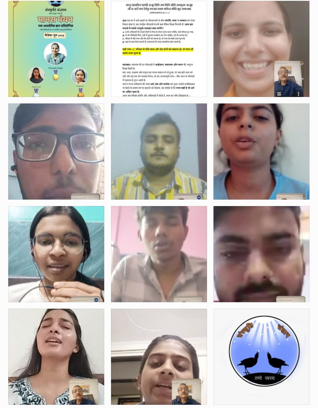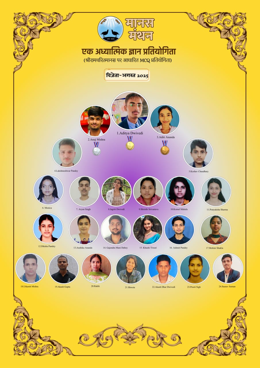 संस्कृति संज्ञान संस्था द्वारा 30 अगस्त 2025 को मानस मंथन ऑनलाइन एमसीक्यू प्रतियोगिता का आयोजन किया गया। इस प्रतियोगिता में 800 से ज्यादा छात्रों ने रजिस्ट्रेशन कराया तथा 500 के करीब छात्रों ने भाग लिया। प्रतियोगिता में प्रथम 20 स्थान निर्धारित करने के लिए 33 छात्र-छात्राओं को ऑनलाइन इंटरव्यू के लिए आमंत्रित किया गया। इंटरव्यू में उन्हें राम अंगद संवाद से चुने हुए 4 दोहे या चौपाइयों की कंठस्थ प्रस्तुति, अर्थ एवं संदेश बताना था। यह बहुत ही सुखद अनुभव है कि इन सभी छात्रों का प्रदर्शन बहुत ही प्रशंसनीय था और प्रथम 20 स्थान निर्धारित करना संस्था के सदस्यों के लिए अत्यंत कठिन कार्य था। काफी विचार विमर्श के पश्चात 24 छात्रों को पुरस्कार और सम्मान के लिए चुना गया। सभी चयनित विद्यार्थियों को संस्था की हार्दिक बधाई और शुभकामनाएं।
