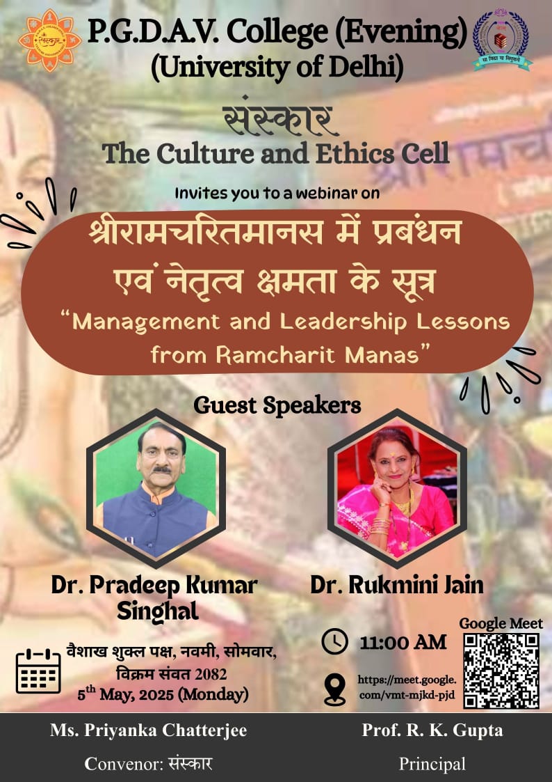 5 मई 2025 को डॉ प्रदीप कुमार सिंघल राष्ट्रीय अध्यक्ष संस्कृति संज्ञान ने पीजीडीएवी कॉलेज दिल्ली विश्वविद्यालय के छात्रों को "श्री रामचरितमानस में प्रबंधन एवं नेतृत्व क्षमता के गुण" विषय पर संबोधित किया। इस कार्यक्रम में कॉलेज के प्रिंसिपल प्रोफेसर आर के गुप्ता, कॉलेज की पूर्व प्रोफेसर डॉ रुक्मणी जैन, कार्यक्रम की संयोजक प्रोफेसर प्रियंका चटर्जी ने चर्चा में भाग लिया। लगभग 50 छात्रों ने वेबीनार में भाग लिया। डॉ सिंघल ने छात्रों को बताया कि वह रामचरितमानस को एक किताब की तरह से पढ़ें, उसके दोहे और चौपाइयों के अर्थ और संदेश को समझें। अगर वह ऐसा नित्य 3 महीने तक करेंगे तो प्रबंधन एवं नेतृत्व क्षमता के महत्वपूर्ण सूत्र उनके मनोमस्तिष्क में समाहित हो जाएंगे और वह अपने जीवन लक्ष्य को प्राप्त करने में सफल होंगे। इसका पूरा वैज्ञानिक एवं व्यवहारिक विश्लेषण डॉ सिंघल ने छात्रों को समझाया। काफी छात्र श्री रामचरितमानस का नित्य पाठ करने के लिए उत्सुक दिखाई दिए।
