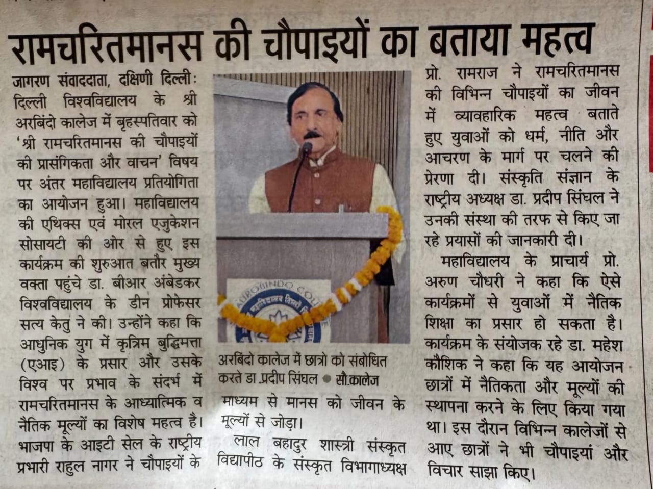 संस्कृति संज्ञान संस्था एवं श्री अरविंद कॉलेज दिल्ली विश्वविद्यालय द्वारा 11 सितंबर 2025 को संगोष्ठी "मानवता के लिए श्री रामचरितमानस एवं रामचरितमानस दोहा वाचन प्रतियोगिता" का आयोजन श्री अरविंद कॉलेज के सम्मेलन कक्ष में किया गया। इस संगोष्ठी के प्रमुख अतिथि प्रोफेसर सत्य केतु, डीन बाबा अंबेडकर यूनिवर्सिटी दिल्ली, विशिष्ट अतिथि प्रोफेसर रामराज उपाध्याय जी डायरेक्टर पुरोहित विभाग श्री लाल बहादुर शास्त्री राष्ट्रीय संस्कृत विश्वविद्यालय, विशिष्ट अतिथि श्री राहुल नागर राष्ट्रीय सोशल मीडिया प्रभारी ओबीसी मोर्चा भारतीय जनता पार्टी, अरविंदो कॉलेज के प्राचार्य प्रोफेसर अरुण चौधरी जी, कार्यक्रम के संयोजक प्रोफेसर महेश कौशिक जी एवं कार्यक्रम के आयोजक डॉक्टर प्रदीप कुमार सिंघल अध्यक्ष संस्कृति संज्ञान संस्था ने अध्यापकों एवं छात्रों को संबोधित किया, रामचरितमानस किस तरह से छात्रों एवं युवाओं के व्यक्तित्व एवं चरित्र निर्माण में सहायक हो सकती है इस पर विस्तृत चर्चा हुई। सम्मेलन कक्ष में उपस्थित सभी अध्यापकों, छात्र-छात्राओं ने संकल्प लिया कि वह श्री रामचरितमानस का नित्य पाठ कुछ समय के लिए अवश्य करेंगे और उसके दोहे और चौपाइयों के संदेश को अपने व्यवहारिक जीवन में समाहित करेंगे ताकि वह परिवार, समाज और राष्ट्र हेतु श्रेष्ठ कार्य करने के लिए प्रोत्साहित हो।